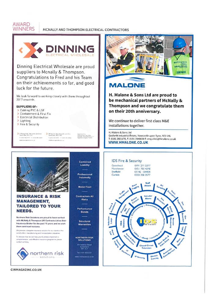 We thank our suppliers Dinning Electrical Wholesalers, H Malone & Sons, IDS Fire & Security, Northern Risk Solutions, Park Electrical Distributors and YESSS Electrical who supported us in this article published in Construction Industry News to celebrate our unprecedented awards success as well as Fred being at the forefront of the business for 20 years.