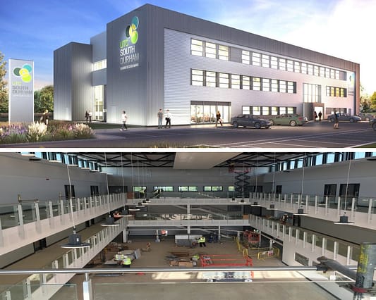 The new £10m University Technical College South Durham on the Aycliffe Business Park. The first UTC (University Technical College) to open in the North East, UTC South Durham in Newton Aycliffe specializes in advanced engineering and manufacturing, providing specialist education to young people aged 14-19 with ambitions to enter employment or higher education in these sectors. Here we were tasked with the complete electrical installation including general teaching areas and the engineering hall, with a 3-storey atrium capable of housing large vehicles. Particular challenges included were the suspended lighting system and extra heavy duty driver over floor boxes.